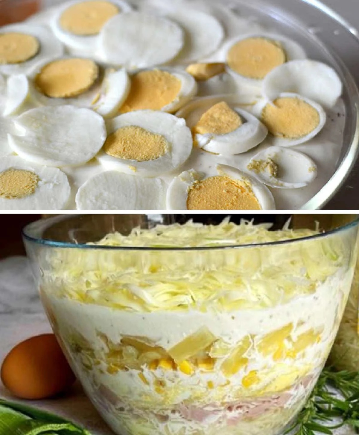 Rychlý vrstvený salát do skleněné mísy: celer, kukuřice, pór, ananas, šunka, vajíčka a sýrová čepice. Přesné ingredience, postup, časy a počet porcí. Skvělý na svátky i pohoštění.
