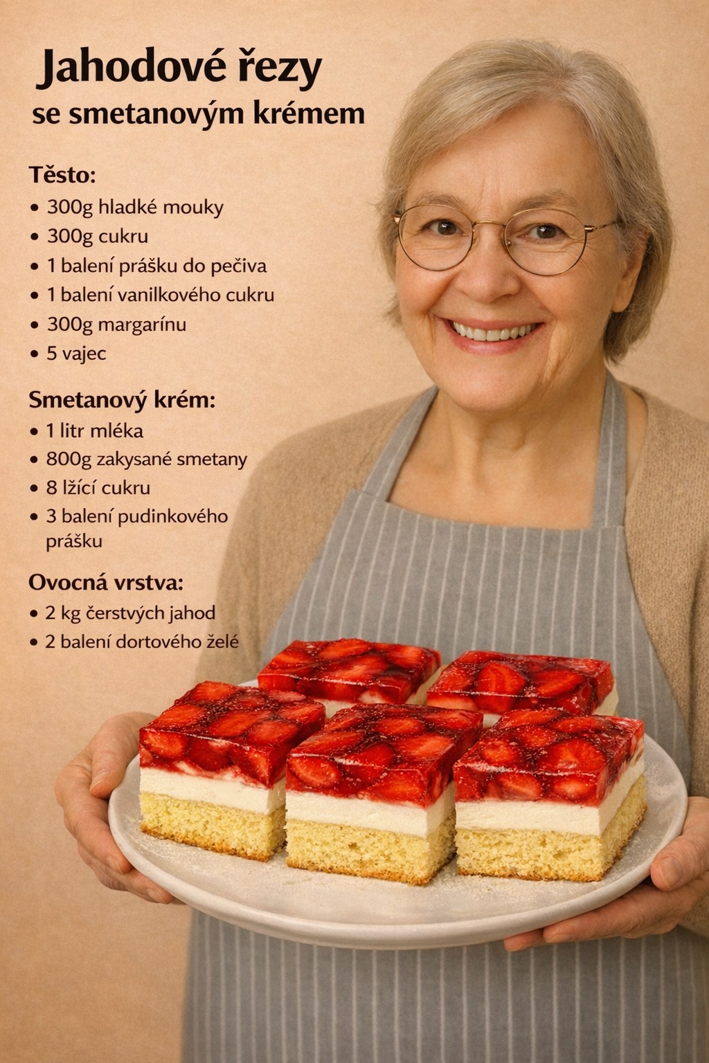 Kombinaci jahod, nadýchaného piškotového korpusu a smetanového krému tohoto dezertu si oblíbí každý. Tyhle jahodové řezy jsou nejen chutné ale také krásně vypadají. Oblíbí si je všichni, kdo mají rádi sladké dezerty. Skvěle se hodí k odpolednímu šálku kávy, pohoštění pro nečekanou návštěvu, nebo na rodinou oslavu.