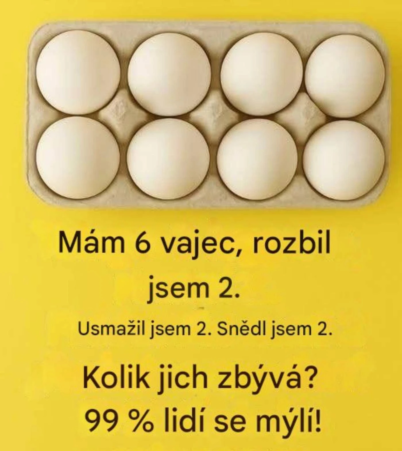 „Mám 6 vajec. Rozbil jsem 2. Usmažil jsem 2. Snědl jsem 2. Kolik vajec mi zbývá?“
