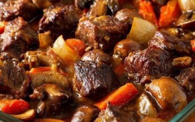 Vydatný zapékaný hovězí s houbami pečený v troubě
