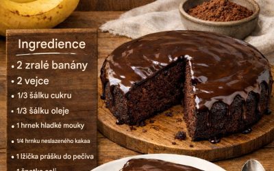 Ingredience: 2 zralé banány 2 vejce 1/2 hrnku cukru 1/3 hrnku oleje 1 hrnek hladké mouky 1/4 hrnku neslazeného kakaového…